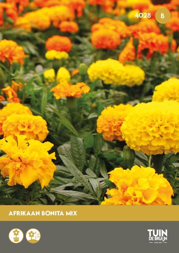 Afrikaantjes Bonita Mix zijn compacte éénjarige planten met een kleurrijke mix van enkel- en dubbelbloemige bloemen in geel, oranje en roodtinten. Ze worden ongeveer 20-30 cm hoog en bloeien rijk van juni tot oktober en zijn ideaal voor borders, potten en perken. Zaaien kan vanaf februari binnenshuis of vanaf april direct buiten. De zaden kiemen binnen 7–14 dagen bij warme temperaturen. Plant ze op een zonnige plek en verwijder regelmatig uitgebloeide bloemen voor een langere bloei. Bonita Mix trekt nuttige insecten aan en werkt tegelijk afwerend