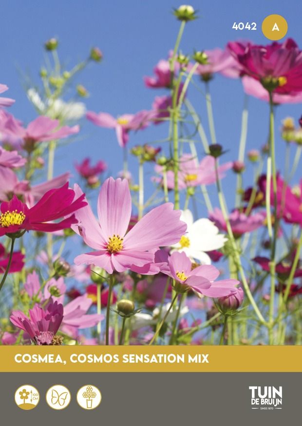 Cosmos Sensation Mix is een éénjarige bloeier met fijne, varenachtige bladeren en grote, open bloemen in tinten roze, paars, rood en wit. De zaden kunnen vanaf maart onder glas of vanaf april direct buiten gezaaid worden. Ze kiemen binnen 10–15 dagen en groeien uit tot sierlijke planten van wel 100–120 cm hoog. Deze cosmos is ideaal voor zonnige borders, langs hekwerk of als snijbloem in boeketten. Door regelmatig uitgebloeide bloemen te verwijderen, bloeit de plant door tot in oktober. De bloemen staan ook leuk als boeketje in kleine vaasjes.