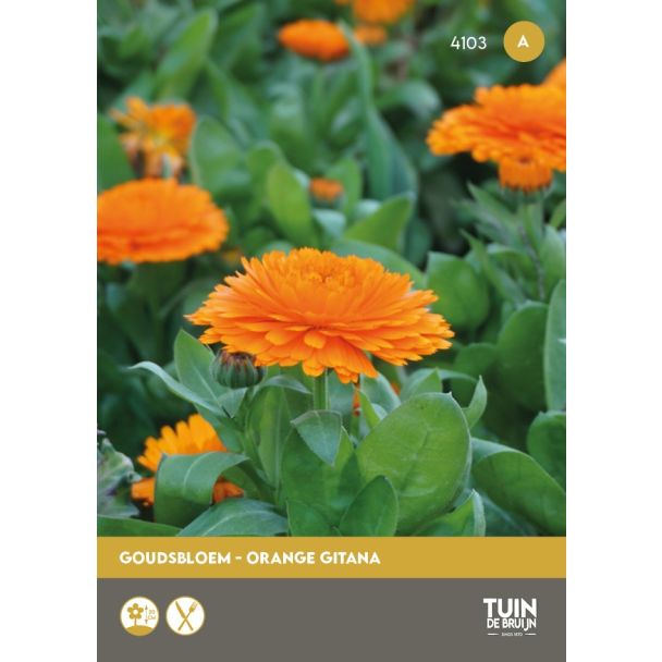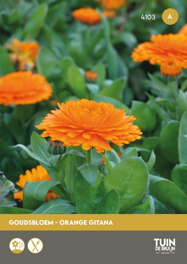 DGoudsbloem Orange Gitana is een laagblijvende, éénjarige bloem met een uitbundige bloei in helder oranje tinten. Deze selectie uit de Gitana-serie is bijzonder geschikt voor potten, borders en perken, en bloeit door tot ver in de herfst. De planten worden ongeveer 30 cm hoog en zijn makkelijk te kweken en te onderhouden. Zaaien kan vanaf maart onder glas of vanaf april direct buiten. De fi jngehakte bloemblaadjes hebben een zoete, pittige smaak en zijn eetbaar — heerlijk in salades of als kleurrijke garnering.