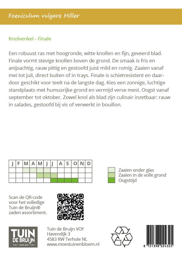 Een robuust ras met hoogronde, witte knollen en fijn, geveerd blad. Finale vormt stevige knollen boven de grond. De smaak is fris en anijsachtig, rauw pittig en gestoofd juist mild en romig. Zaaien vanaf mei tot juli, direct buiten of in trays. Finale is schietresistent en daardoor geschikt voor teelt na de langste dag. Kies een zonnige, luchtige standplaats met humusrijke grond en vermijd verse mest. Oogst vanaf september tot oktober. Zowel knol als blad zijn culinair inzetbaar: rauw in salades, gestoofd bij vis of verwerkt in bouillon.