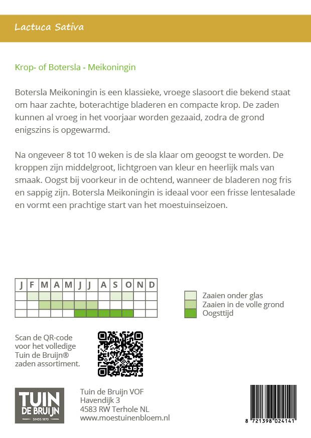 Botersla Meikoningin is een klassieke, vroege slasoort die bekend staat om haar zachte, boterachtige bladeren en compacte krop. De zaden kunnen al vroeg in het voorjaar worden gezaaid, zodra de grond enigszins is opgewarmd.