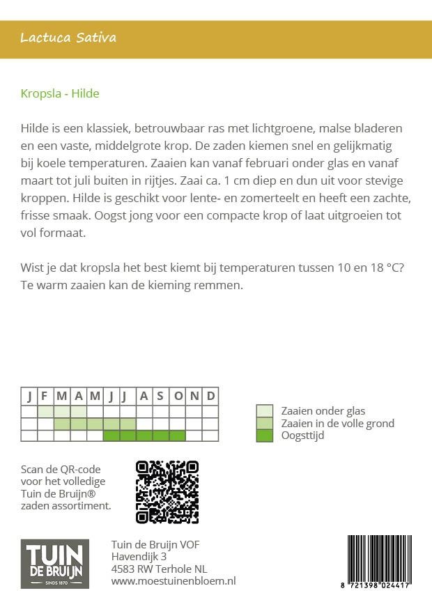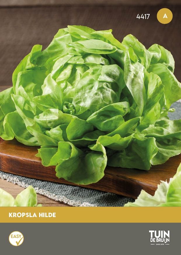Hilde is een klassiek, betrouwbaar ras met lichtgroene, malse bladeren en een vaste, middelgrote krop. De zaden kiemen snel en gelijkmatig bij koele temperaturen. Zaaien kan vanaf februari onder glas en vanaf maart tot juli buiten in rijtjes. Zaai ca. 1 cm diep en dun uit voor stevige kroppen. Hilde is geschikt voor lente- en zomerteelt en heeft een zachte, frisse smaak. Oogst jong voor een compacte krop of laat uitgroeien tot vol formaat. Wist je dat kropsla het best kiemt bij temperaturen tussen 10 en 18 °C? Te warm zaaien kan de kieming remmen.
