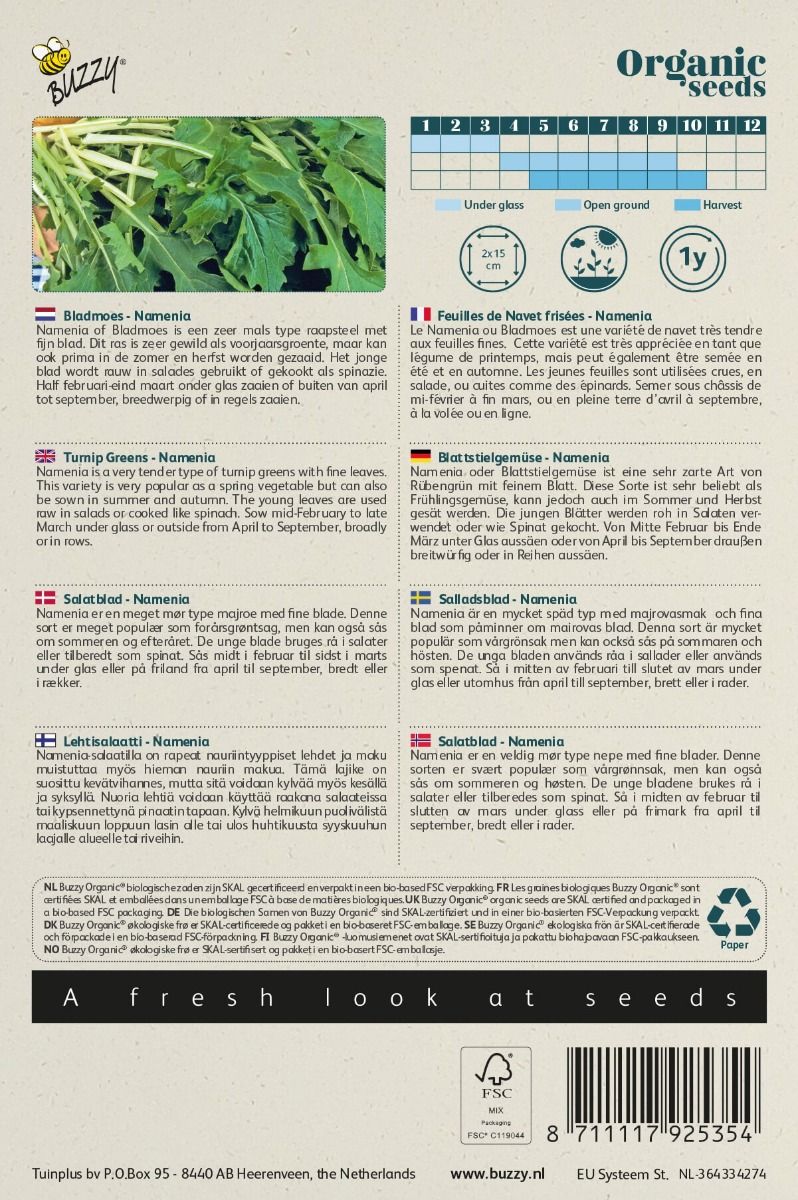 Namenia of Bladmoes is een zeer mals type raapsteel met fijn blad. Dit ras is zeer gewild als voorjaarsgroente, maar kan ook prima in de zomer en herfst worden gezaaid. Het jonge blad wordt rauw in salades gebruikt of gekookt als spinazie. Half februari-eind maart onder glas zaaien of buiten van april tot september, breedwerpig of in regels zaaien.