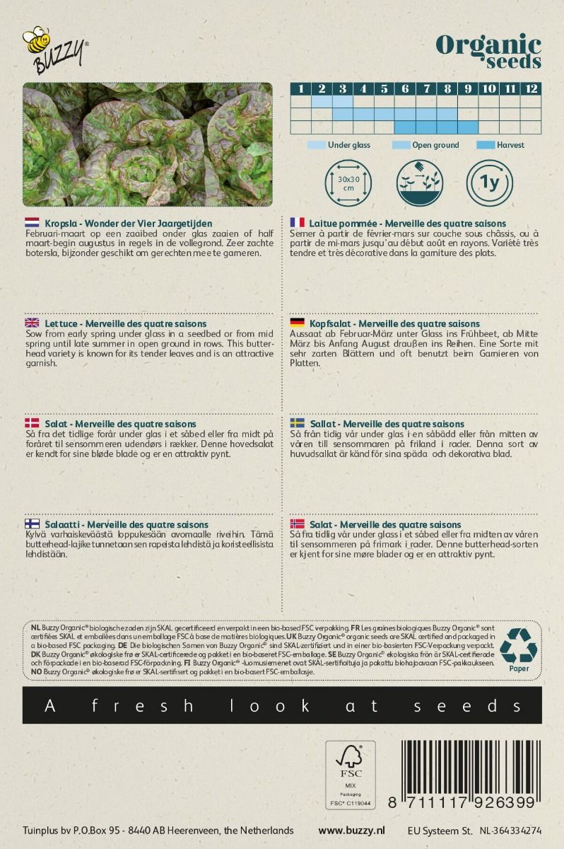 Februari-maart op een zaaibed onder glas zaaien of half maart- begin augustus in regels in de vollegrond. Zeer zachte botersla, bijzonder geschikt om gerechten mee te garneren.