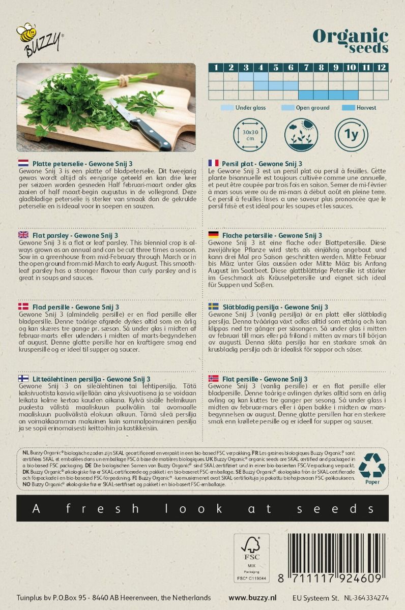 Gewone Snij 3 is een platte of bladpeterselie. Dit tweejarig gewas wordt altijd als eenjarige geteeld en kan drie keer per seizoen worden gesneden Half februari-maart onder glas zaai en of half maart-begin augustus in de vollegrond. Deze glad bladige peterselie is sterker van smaak dan de gekrulde peterselie en is ideaal voor in soepen en sauzen.
