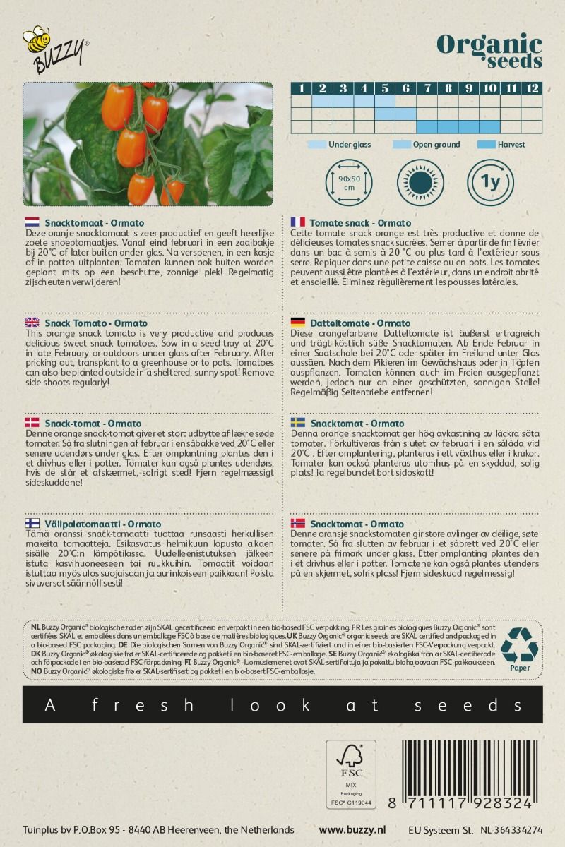Deze oranje snacktomaat is zeer productief en geeft heerlijke zoete snoeptomaatjes. Vanaf eind februari in een zaaibakje bij 20°C of later buiten onder glas. Na verspenen, in een kasje of in potten uitplanten. Tomaten kunnen ook buiten worden geplant mits op een beschutte, zonnige plek! Regelmatig zijscheuten verwijderen!