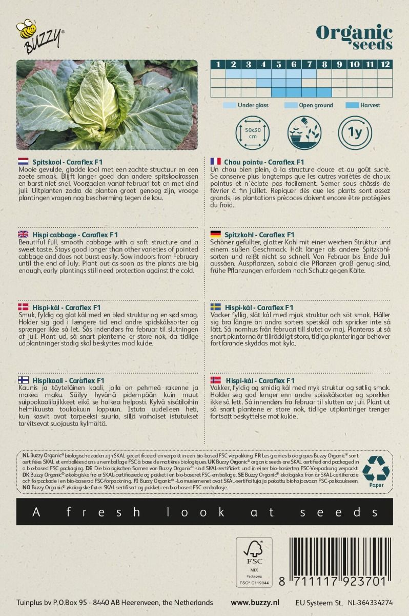 Mooie gevulde, gladde kool met een zachte structuur en een zoete smaak. Blijft langer goed dan andere spitskoolrassen en barst niet snel. Voorzaaien vanaf februari tot en met eind juli. Uitplanten zodra de planten groot genoeg zijn, vroege plantingen vragen nog bescherming tegen de kou.