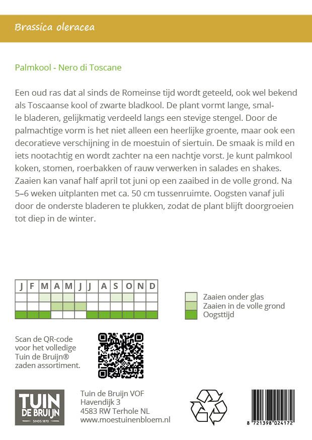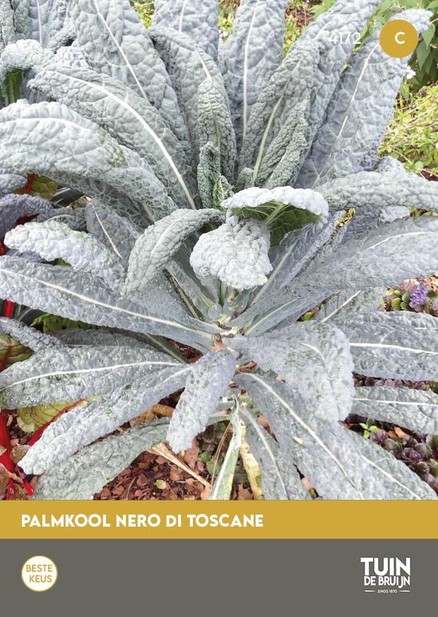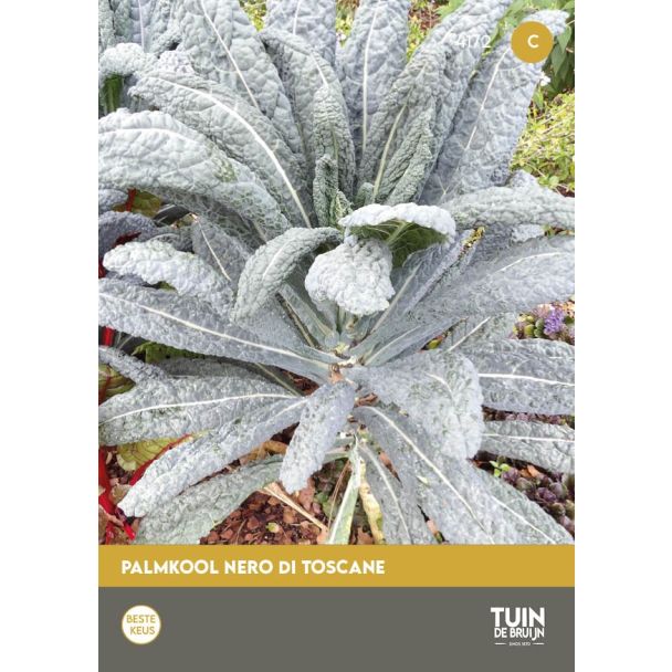 Een oud ras dat al sinds de Romeinse tijd wordt geteeld, ook wel bekend als Toscaanse kool of zwarte bladkool. De plant vormt lange, smalle bladeren, gelijkmatig verdeeld langs een stevige stengel. Door de palmachtige vorm is het niet alleen een heerlijke groente, maar ook een decoratieve verschijning in de moestuin of siertuin. De smaak is mild en iets nootachtig en wordt zachter na een nachtje vorst. Je kunt palmkool koken, stomen, roerbakken of rauw verwerken in salades en shakes. Zaaien kan vanaf half april tot juni op een zaaibed in de volle grond. Na 5–6 weken uitplanten met ca. 50 cm tussenruimte. Oogsten vanaf juli door de onderste bladeren te plukken, zodat de plant blijft doorgroeien tot diep in de winter.