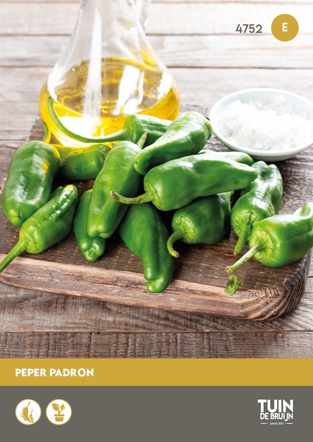Padrón is een milde Spaanse peper die vooral jong geoogst heerlijk zacht van smaak is. Dit populaire pepertje vormt kleine, groene vruchten die je in hun geheel kunt bakken of grillen – een echte klassieker in de Spaanse keuken.
