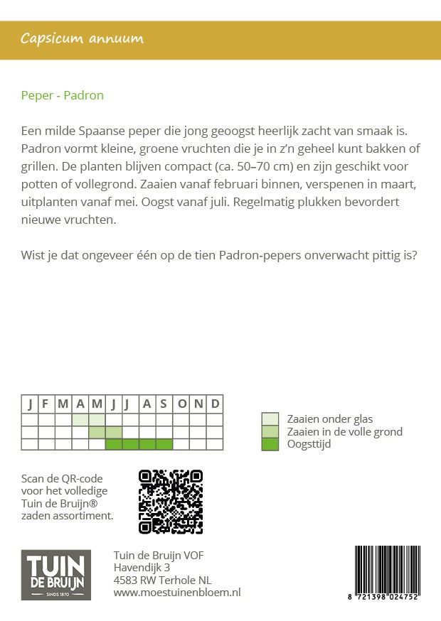 Wil je zelf milde Spaanse pepers telen? Met de Peper Padrón zaden van Tuin de Bruijn kweek je een karakteristiek, smakelijk pepertje dat vooral jong geplukt heerlijk zacht is van smaak. De planten vormen kleine groene vruchten die je in hun geheel kunt bakken, grillen of roerbakken – een echte smaakmaker in de mediterrane en Spaanse keuken.
