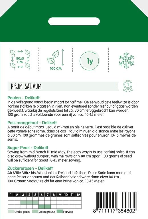 Peulen Delikett is een peul van het peul/erwt of sugar snap type. Deze peulvruchten zijn jong in geheel, als peultjes te gebruiken en ouder te doppen als doperwten. De smaak is extra zoet. De planten worden ca. 65 cm hoog, daarom is teelt langs gaas of rijshout aan te raden maar niet persé nodig. Zaaien: vanaf februari – bij niet vriezend weer – tot in april direct in de vollegrond. Zaai op regels of rijen (al dan niet langs gaas) met een onderlinge afstand van 45 cm en zet de zaden in de rij 5 cm uit elkaar. Zorg dat de grond tijdens de groei voldoende vochtig blijft. Oogst: van juni tot half juli. Pluk de peulen vooral zo jong mogelijk (als ze nog sappig zijn). Regelmatig doorplukken is dus aan te raden. Geschikt voor invriezen.