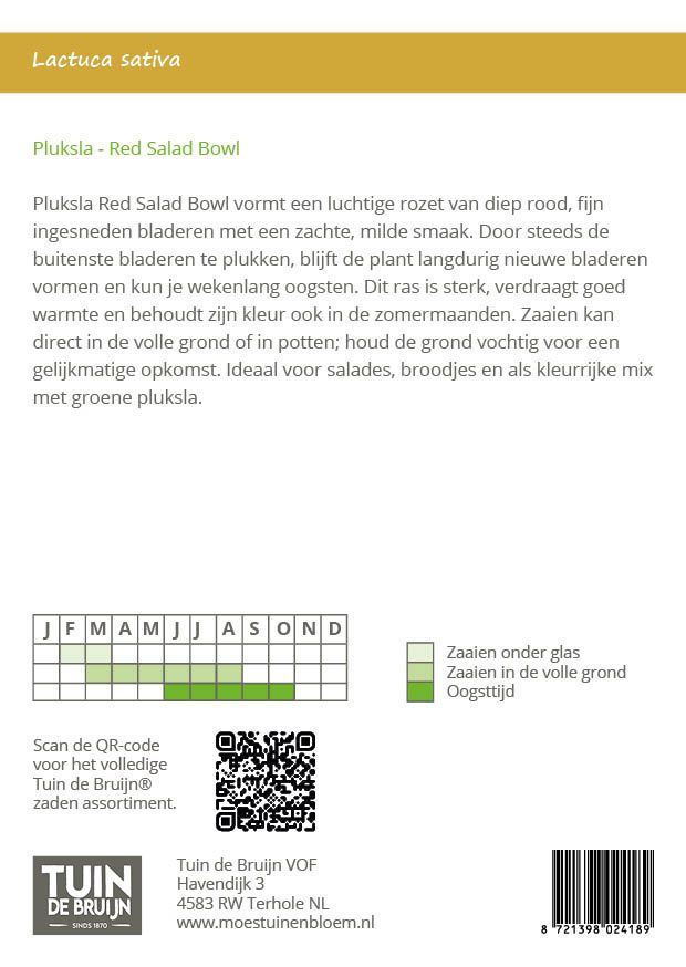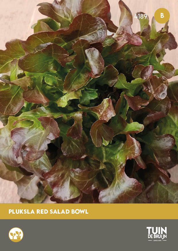 Pluksla Red Salad Bowl vormt een luchtige rozet van diep rood, fijn ingesneden bladeren met een zachte, milde smaak. Door steeds de buitenste bladeren te plukken, blijft de plant langdurig nieuwe bladeren vormen en kun je wekenlang oogsten. Dit ras is sterk, verdraagt goed warmte en behoudt zijn kleur ook in de zomermaanden. Zaaien kan direct in de volle grond of in potten; houd de grond vochtig voor een gelijkmatige opkomst. Ideaal voor salades, broodjes en als kleurrijke mix met groene pluksla.