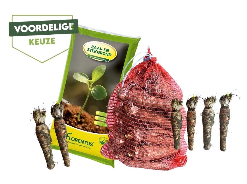 Je ontvangt 25 mooie kwaliteit witlofwortels in een net (ca. 5 kg) + 10L potgrond geschikt voor de witlofkweek.