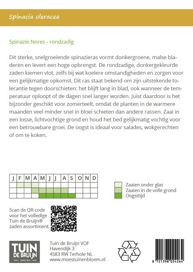 Dit sterke, snelgroeiende spinazieras vormt donkergroene, malse bladeren en levert een hoge opbrengst. De rondzadige, donkergekleurde zaden kiemen vlot, zelfs bij wat koelere omstandigheden en zorgen voor een gelijkmatige opkomst. Dit ras staat bekend om zijn uitstekende tolerantie tegen doorschieten: het blijft lang in blad, ook wanneer de temperatuur oploopt of de dagen snel langer worden. Juist daardoor is het bijzonder geschikt voor zomerteelt, omdat de planten in de warmere maanden veel minder snel in bloei schieten dan andere rassen. Zaai in een losse, lichtvochtige grond en houd het bed gelijkmatig vochtig voor een betrouwbare groei. De oogst is ideaal voor salades, wokgerechten of om te koken.
