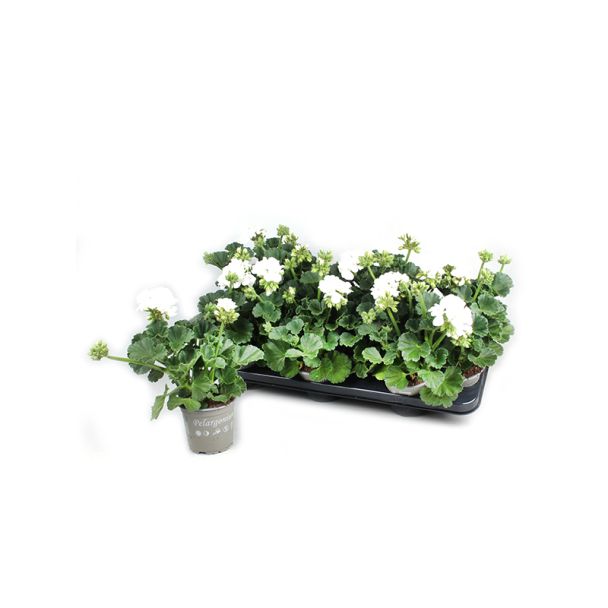 De staande geraniums wit (Pelargonium zonale) zijn perfecte planten voor een frisse en stijlvolle uitstraling in tuin, balkon en terras. Deze zomerbloeiers staan bekend om hun lange bloeiperiode en heldere witte bloemen die rust en licht brengen in iedere buitenruimte.