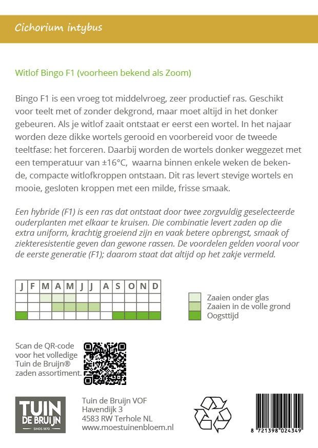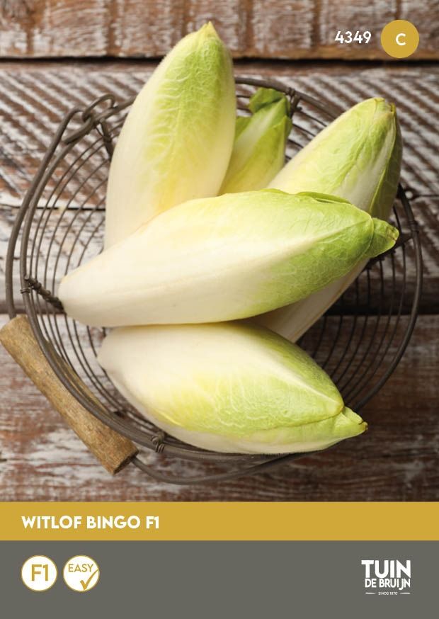 Bingo F1 is een vroeg tot middelvroeg, zeer productief ras. Geschikt voor teelt met of zonder dekgrond, maar moet altijd in het donker gebeuren. Als je witlof zaait ontstaat er eerst een wortel. In het najaar worden deze dikke wortels gerooid en voorbereid voor de tweede teeltfase: het forceren. Daarbij worden de wortels donker weggezet met een temperatuur van ±16°C, waarna binnen enkele weken de bekende, compacte witlofkroppen ontstaan. Dit ras levert stevige wortels en mooie, gesloten kroppen met een milde, frisse smaak.