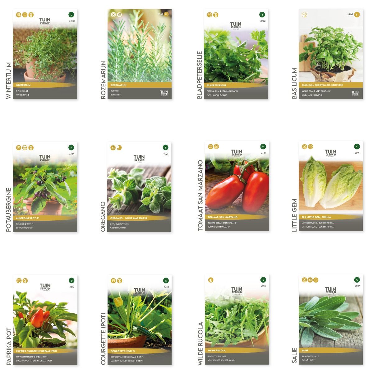 Je ontvangt de volgende 12 groente- en kruidensoorten: